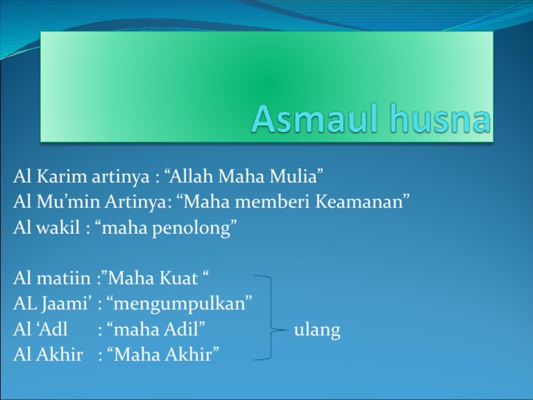 Demikian artikel yang dapat kami bagikan tentang salah satu nama dalam asmaul husna dan semoga bermanfaat. Misalnya juallah mobilku dengan harga 100 juta jika kontan dan 150 juta jika kredit. Berdiam diri dan tidak peduli terhadap sebab itu dan akibatnya adalah sikap malas. Apabila maksud yang terkandung dalam wakalah itu sudah selesai pelaksanaannya atau dihentikan maksud dari pekerjaan tersebut. Orang harus berusaha untuk mendapatkan apa yang diinginkannya.